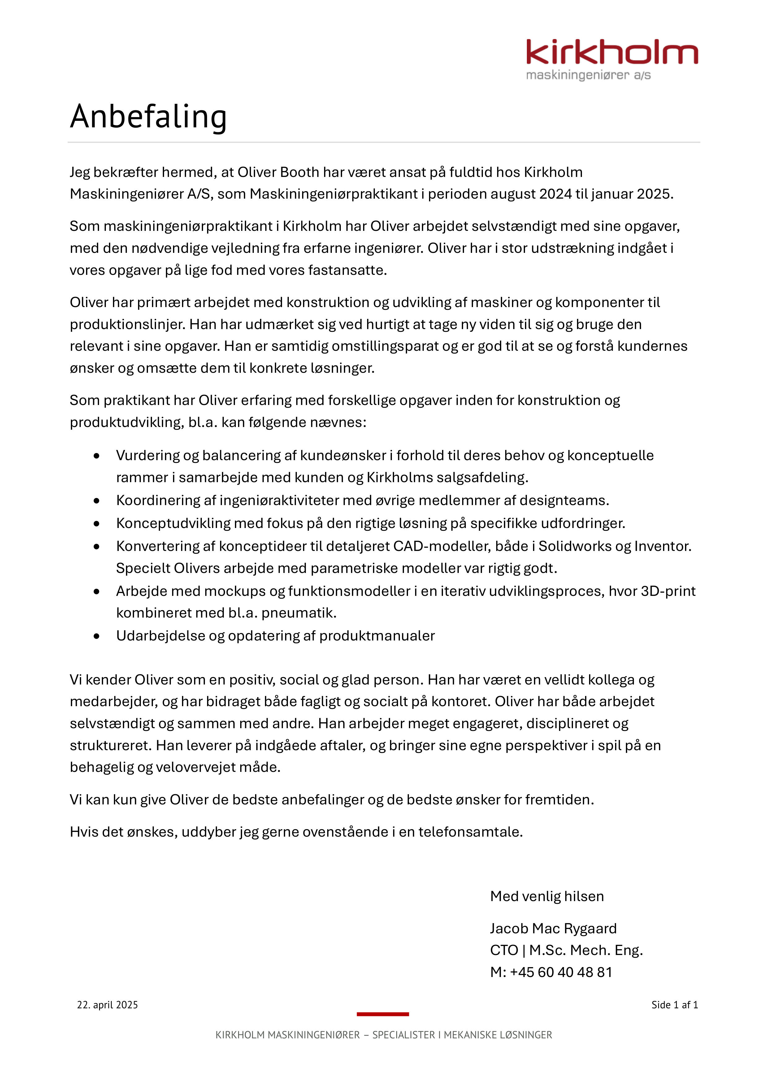 We confirm that Oliver Booth was employed full-time at Kirkholm Maskiningeniører A/S as a Mechanical Engineering Intern from August 2024 to January 2025.As a mechanical engineering intern at Kirkholm, Oliver worked independently on his tasks, receiving necessary guidance from experienced engineers. Oliver demonstrated great initiative in his assignments, often going beyond what was expected.Oliver has primarily worked on the design and development of machines and components for production lines. He has distinguished himself by quickly acquiring new knowledge and applying it effectively in his tasks. He is meticulous and skilled at understanding and addressing customer needs, translating them into concrete solutions.As an intern, Oliver gained experience with diverse tasks related to construction and product development, including: